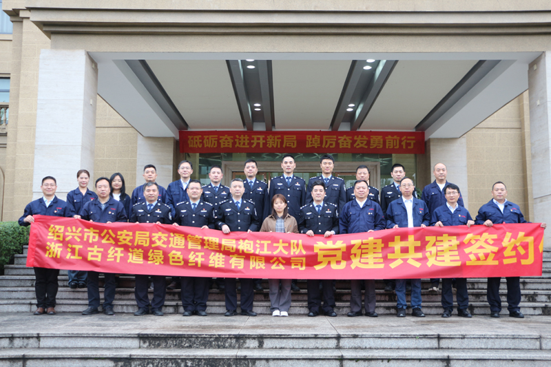 隨后,在熱烈的掌聲中,雙方代表簽署了《黨建共建協(xié)議書》。這份協(xié)議不僅明確了雙方共建的目標(biāo)、原則和內(nèi)容,還規(guī)劃了具體的合作項(xiàng)目和活動(dòng)安排,為后續(xù)的深度合作奠定了堅(jiān)實(shí)的基礎(chǔ)。緊接著,進(jìn)行了激動(dòng)人心的揭牌儀式。隨著紅綢緩緩落下,“浙江古纖道綠色纖維有限公司-紹興市公安局交通管理局袍江大隊(duì)黨建共建基地”的牌子赫然顯現(xiàn),標(biāo)志著雙方黨建共建的新篇章正式開啟。