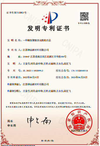 金浦集團旗下企業——江蘇鐘山新材料有限公司近日又一項發明專利《一種制備聚醚多元醇的方法》喜獲國家知識產權局授權,專利號:ZL 202211053099.2。